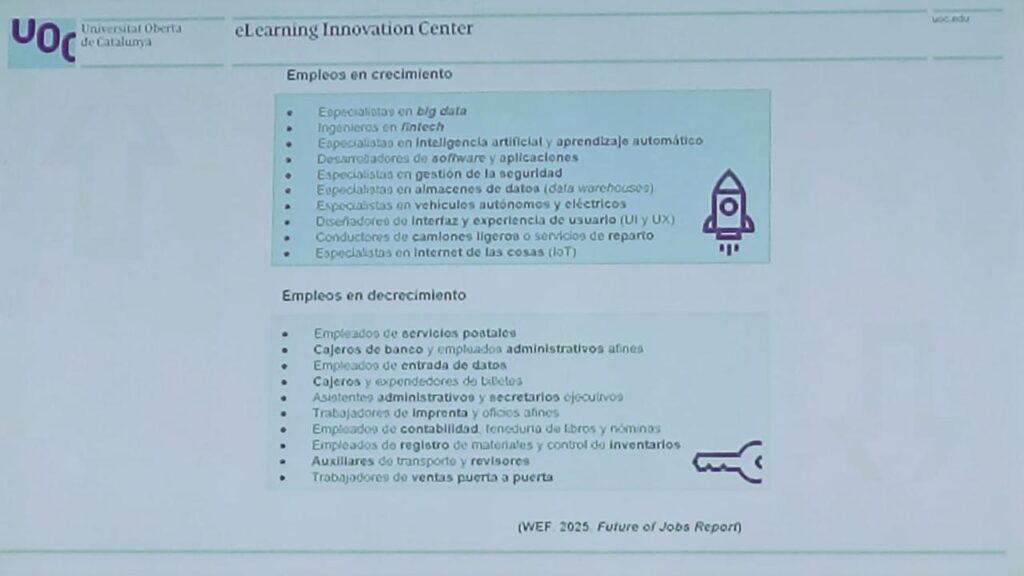 Listas de empleos en crecimiento y descreciiento, según el eLearning Innovation Center de la UOC. Firma: F. H.