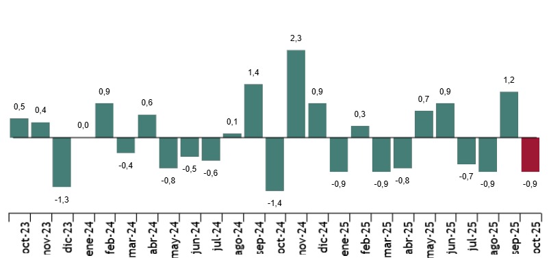 Por destino económico de los bienes, Bienes de consumo duraderos (1,6%), Bienes de consumo no duraderos (0,3%) y Bienes intermedios (0,1%) presentaron tasas mensuales positivas. Por su parte, Energía1 (-2,2%) y Bienes de equipo (-0,8%) registraron tasas negativas.