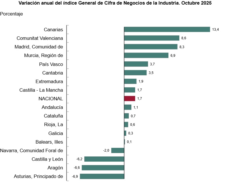 El índice de cifra de negocios aumentó respecto a octubre de 2024 en 13 comunidades autónomas y disminuyó en las otras cuatro.