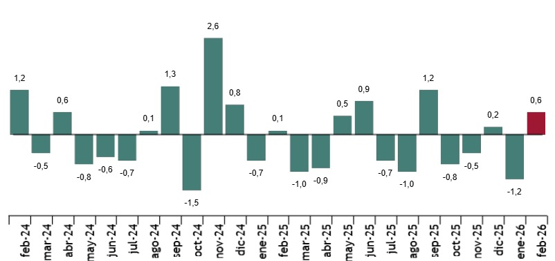 Por destino económico de los bienes, cuatro de los cinco sectores presentaron tasas mensuales positivas. Energía (4,4%) y Bienes de equipo (1,4%) registraron los mayores aumentos. El único sector que descendió fue Bienes de consumo duradero (-0,8%).