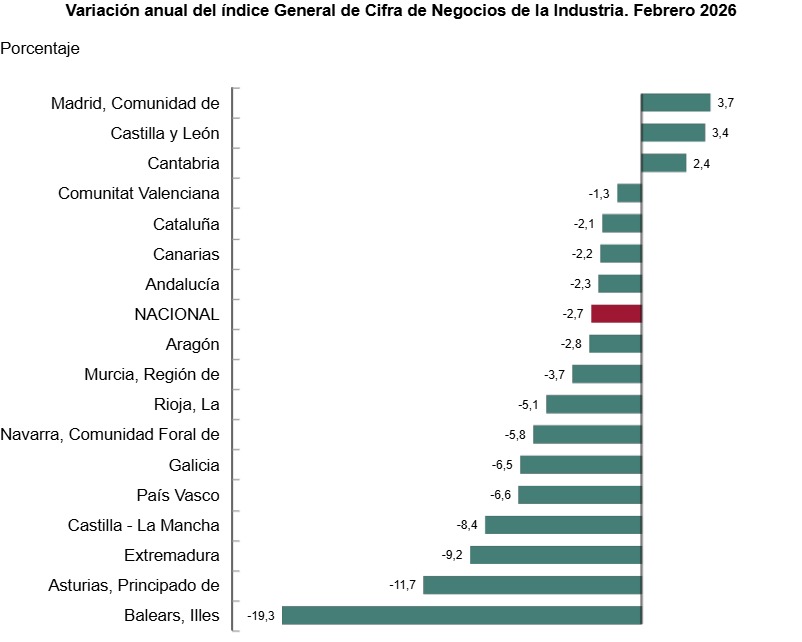 El índice de cifra de negocios aumentó respecto a febrero de 2025 en tres comunidades autónomas y disminuyó en las otras 14.