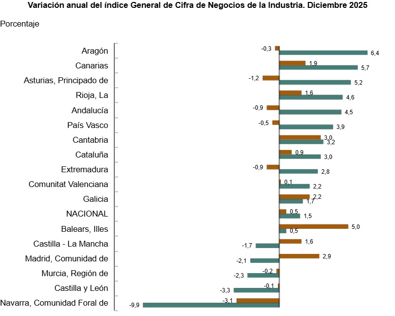 El índice de cifra de negocios aumentó respecto a diciembre de 2024 en 12 comunidades autónomas y disminuyó en las otras cinco.