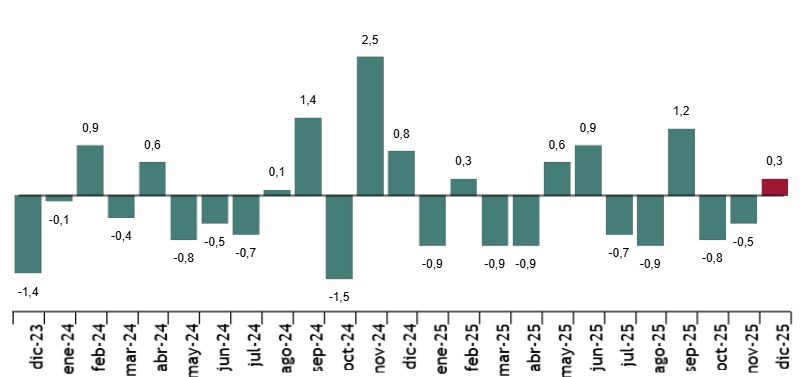Por destino económico de los bienes, Energía (1,5%), Bienes de equipo (1,1%) y Bienes intermedios (0,4%) presentaron tasas mensuales positivas. Por su parte, Bienes de consumo duraderos (-4,0%) y Bienes de consumo no duraderos (-1,8%) registraron tasas negativas.