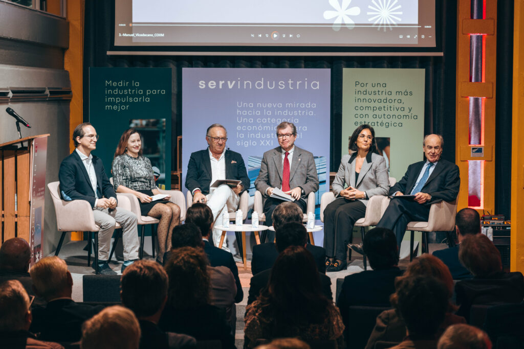 Torres subrayó la necesidad de esta nueva mirada. «Todos sabemos que queremos alcanzar ese 20% del PIB industrial, pero para ello necesitamos contemplar todo lo que rodea a la industria. Es lo que ahora conocemos como servindustria». Y procedió a leer la definición consensuada por el equipo de trabajo multidisciplinar, compuesto por expertos del Coiim, la Universidad Politécnica de Madrid (UPM), la Escuela de Organización Industrial (EOI) y la Asociación de Empresas del Metal de Madrid (Aecim): «Conjunto de servicios industriales —técnicos, científicos y de conocimiento— que abarcan todo el ciclo de vida del producto, desde su diseño hasta su consumo final o tratamiento como residuo, con el objetivo de asegurar y fortalecer el funcionamiento, la modernización y la competitividad del sistema industrial».