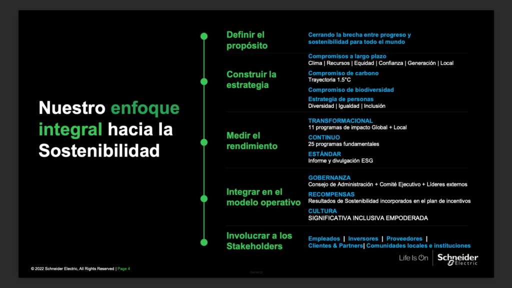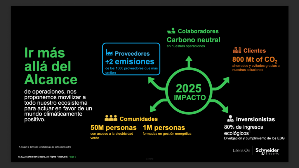 La compañía continúa demostrando avances transparentes frente a sus ambiciosas metas ambientales, entre las que se incluyen una reducción absoluta del 25 % de carbono en toda su cadena de valor para 2030, y el objetivo de cero emisiones netas de CO? en toda la cadena de valor para 2050. Su programa Schneider Sustainability Impact 2021–2025 (SSI), validado por la iniciativa SBTi, actúa como hoja de ruta para avanzar hacia una transformación sostenible, no solo para Schneider Electric y sus partners, sino también para sus clientes y comunidades locales.