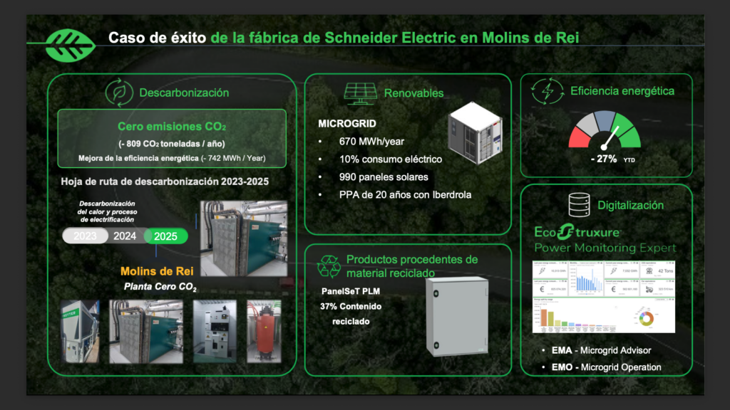 Además, fomenta la ecoeficiencia en sus factorías, que utilizan sus propias soluciones de Internet de las Cosas (IoT) y software (EcoStruxure) para optimizar el consumo energético en tiempo real, reducir residuos y minimizar el uso de agua. La fábrica de Le Vaudreuil en Francia, por ejemplo, es ya considerada un modelo de fábrica sostenible del futuro. Mucho más cerca de nuestra geografía es visible el caso de éxito de la factoria de Molins de Rei, situada en la provincia de Barcelona.